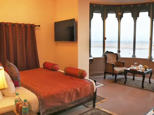 The Dhanurdhara Rooms come with the option of a double bed or twin beds, depending on your preference. These rooms in Varanasi also have access to the terrace that provides magnificent views of the city and river.