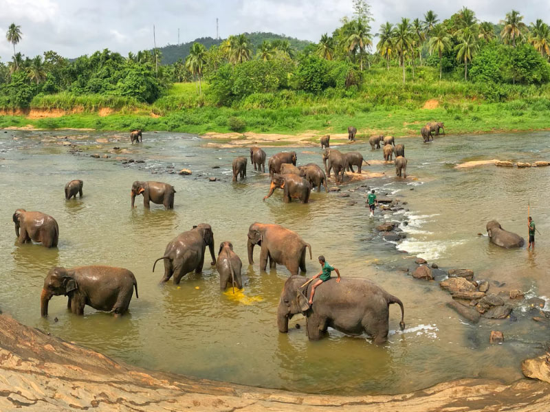 The orphanage was originally founded to provide care and protection to the many orphaned elephants found in the jungles of Sri Lanka. Pinnawala has the largest herd of captive elephants in the world. Tourists can observe the bathing elephants from the broad riverbank as the herd interacts socially, bathing and playing. The orphanage is open to the public daily.