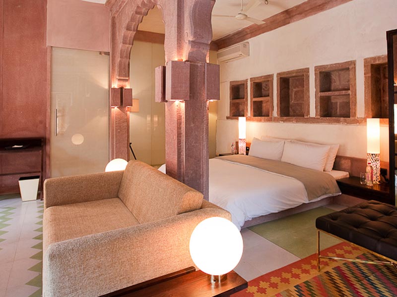 RAAS is Jodhpur’s first boutique hotel. Our signature look was born from the fusion of modern and ancient styles and the courtyard has become a tranquil haven within the bustle of Jodhpur’s old town. The hotel comprises four original buildings with three additional contemporary structures, influenced by and contributing to its cultural past as part of the Walled City. The new buildings are modern and contemporary in their use of space and light, and yet grounded in tradition. Indeed, each of its structures is adorned with intricate architectural carvings in the iconic Haveli style of the 18th century, juxtaposed against modern designs and patterns. Jodhpur’s red sand-stone unites the new with the old, as modern designs add an exciting and fresh dimension to the region’s age-old stone carving industry. The magnificent pool, along with the staff quarters and guardhouse, makes a stunning entry to the hotel.