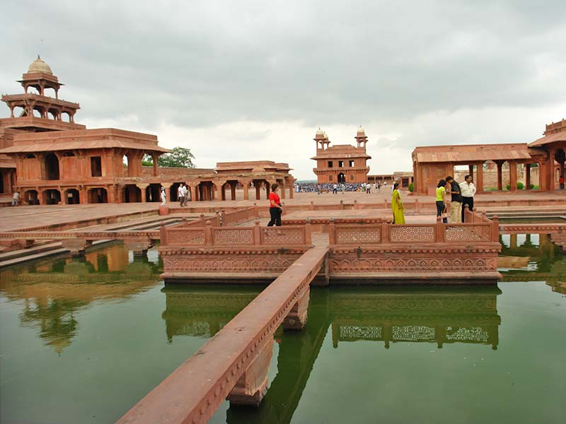 Fatehpur Sikri is a small city in northern India, just west of Agra, founded by a 16th-century Mughal emperor. Red sandstone buildings cluster at its center. Buland Darwaza gate is the entrance to Jama Masjid mosque. Nearby is the marble Tomb of Salim Chishti. Diwan-E-Khas hall has a carved central pillar. Jodha Bais Palace is a mix of Hindu and Mughal styles, next to the 5-story Panch Mahal that overlooks the site.